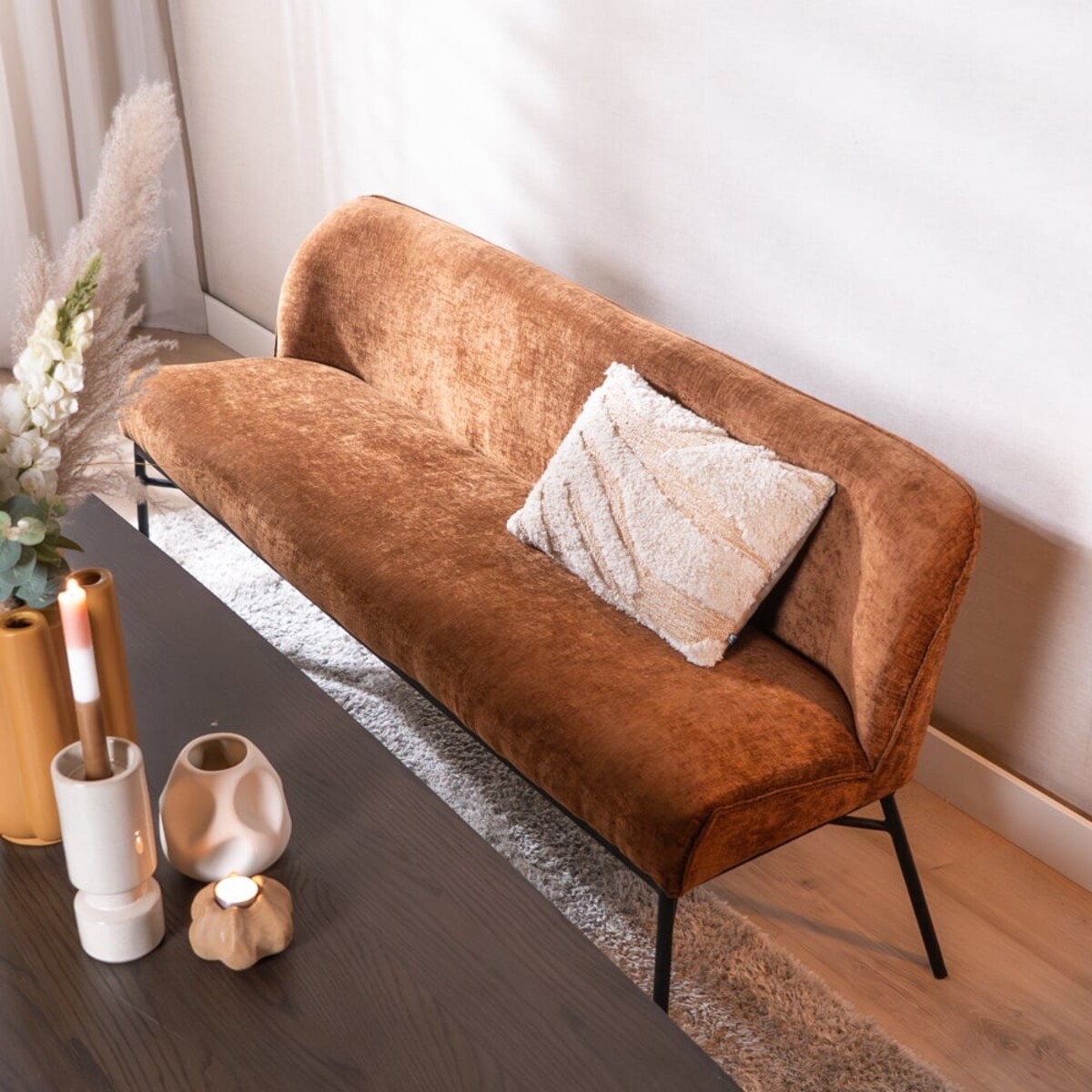 Découvrez le banc de salle à manger Momo Chenille cuivre 155 cm. Ce banc se distingue par sa couleur vive et offre un confort optimal pour 2 à 3 personnes. Grâce à son design unique et à son tissu chenille de haute qualité, il constitue un véritable point fort dans votre intérieur et est idéal pour ceux qui recherchent à la fois fonctionnalité et esthétique. Mesurez soigneusement la distance entre les pieds de la table pour vous assurer que le banc s’y glisse parfaitement.