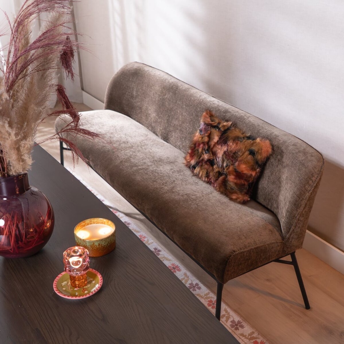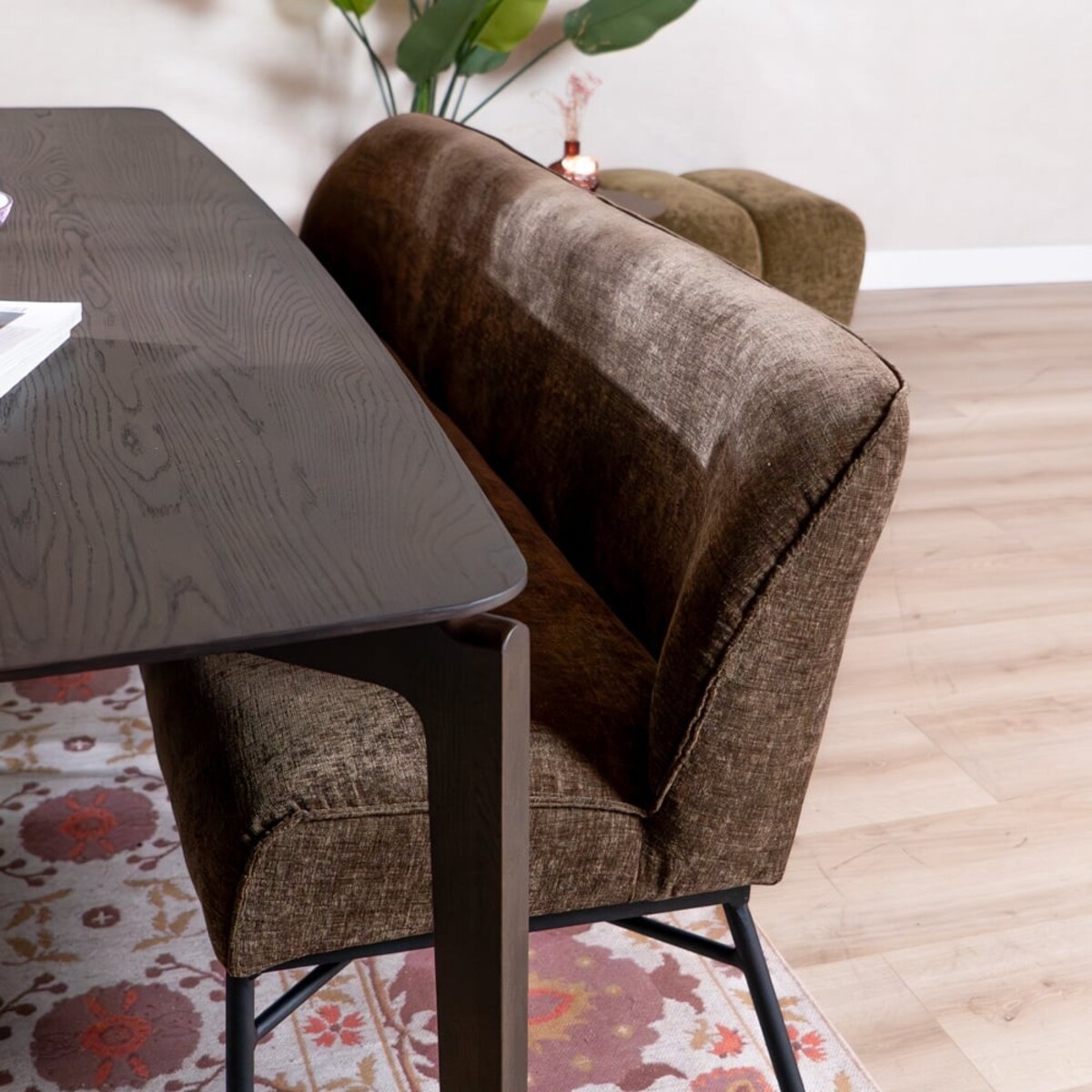 Le banc Momo s’intègre parfaitement dans différents styles d’aménagement. Le tissu en chenille mocha apporte une apparence chaleureuse et séduisante, tandis que le ressort Nosag solide dans l’assise garantit un confort durable. Combinez facilement le banc avec les tabourets ou chaises Momo pour créer un ensemble harmonieux autour de la table. Mesurez soigneusement la distance entre les pieds de la table pour vous assurer que le banc s’y adapte parfaitement.
