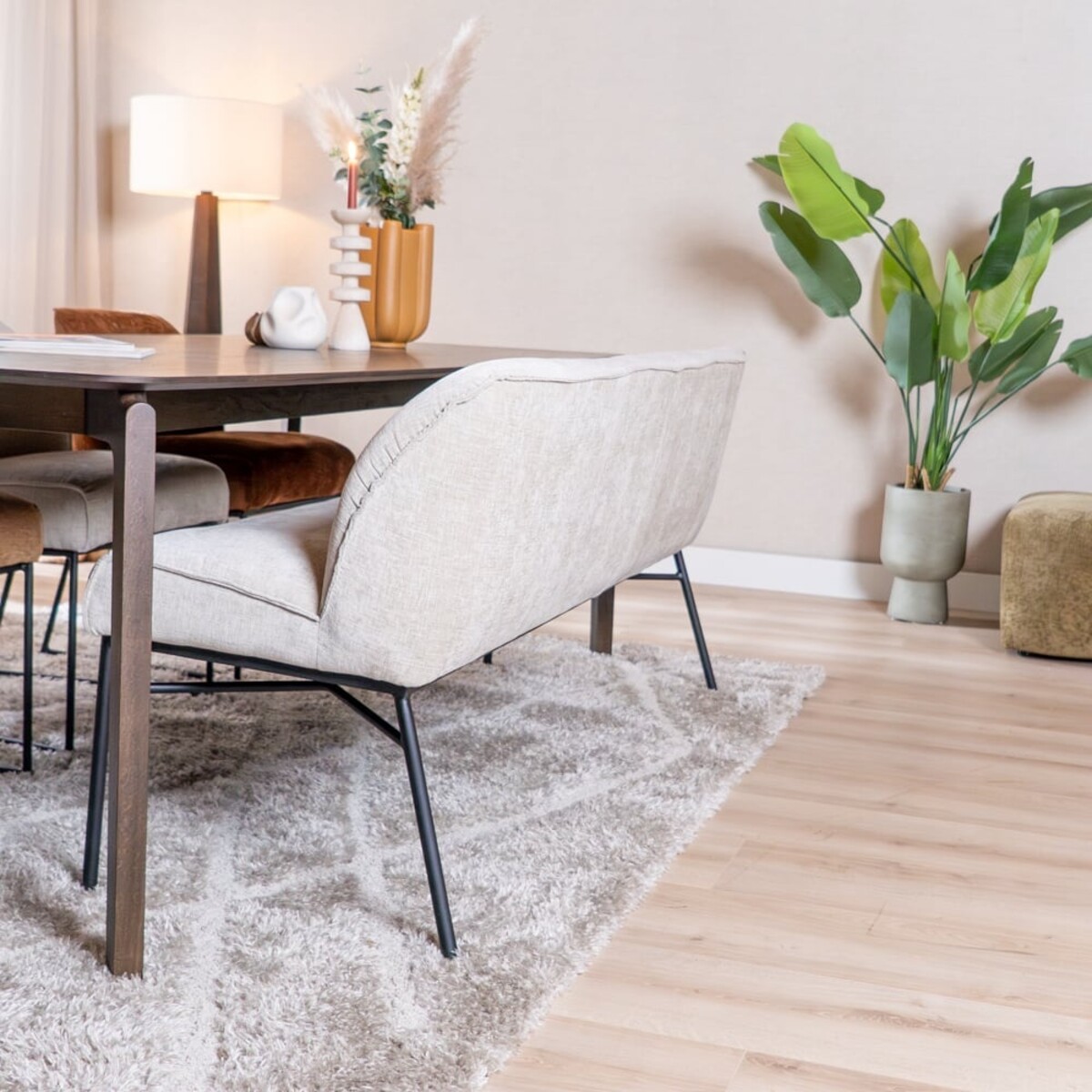 Fais connaissance avec le banc de salle à manger Momo en chenille couleur sand de 220 cm. Un banc élégant pour chaque coin repas, idéal pour accueillir 4 personnes. Grâce à son design intemporel et à son assise douce, il apporte une touche luxueuse à ta salle à manger tout en te permettant de profiter de moments conviviaux autour de la table.