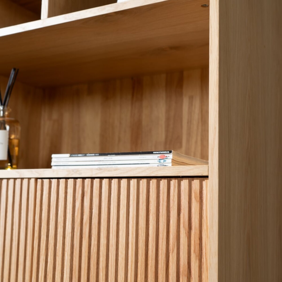 Les façades des portes présentent un motif rayé qui confère au cabinet en bois un aspect élégant. Le design strié rappelle celui d'un panneau mural effet tasseaux de bois, ce qui rend le meuble parfaitement adapté à la tendance de ces panneaux acoustiques décoratifs. Les portes du placard sont également dotées d'un système de fermeture en douceur (soft close). Une porte à fermeture freinée est très facile à fermer silencieusement et ne risque pas d'endommager le meuble si elle est fermée trop brusquement.