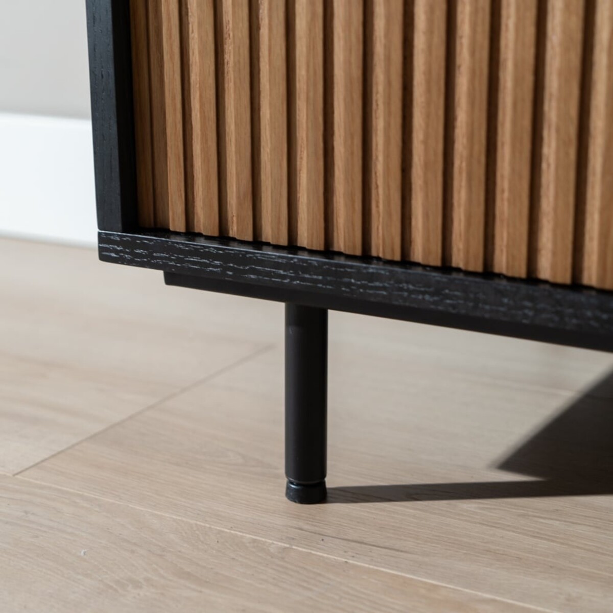 Les façades des portes présentent un motif rayé qui confère au cabinet en bois un aspect élégant. Le design strié rappelle celui d'un panneau mural effet tasseaux de bois, ce qui rend le meuble parfaitement adapté à la tendance de ces panneaux acoustiques décoratifs. Les portes du placard sont également dotées d'un système de fermeture en douceur (soft close). Une porte à fermeture freinée est très facile à fermer silencieusement et ne risque pas d'endommager le meuble si elle est fermée trop brusquement.
