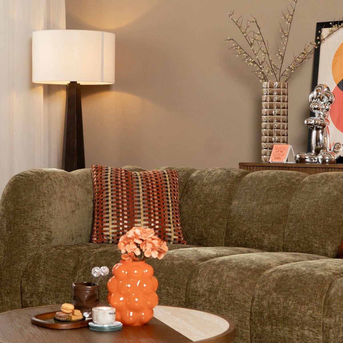 Le canapé Luca est recouvert de notre tissu Eddy, une chenille de haute qualité composée à 100 % de polyester. Ce tissu durable se caractérise par une structure pleine et riche, agréable au toucher et déperlante. L’indice Martindale de 60 000 montre que le revêtement est extrêmement résistant à l’usure et supporte parfaitement une utilisation quotidienne intensive. Les formes arrondies du canapé, combinées à la structure rayée, donnent au modèle une allure ludique et accueillante.\