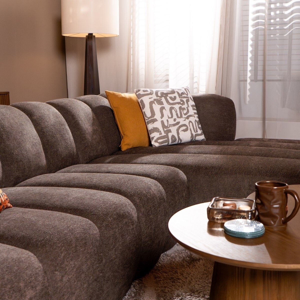 Canapé d’angle droit Luca en tissu chenille brun