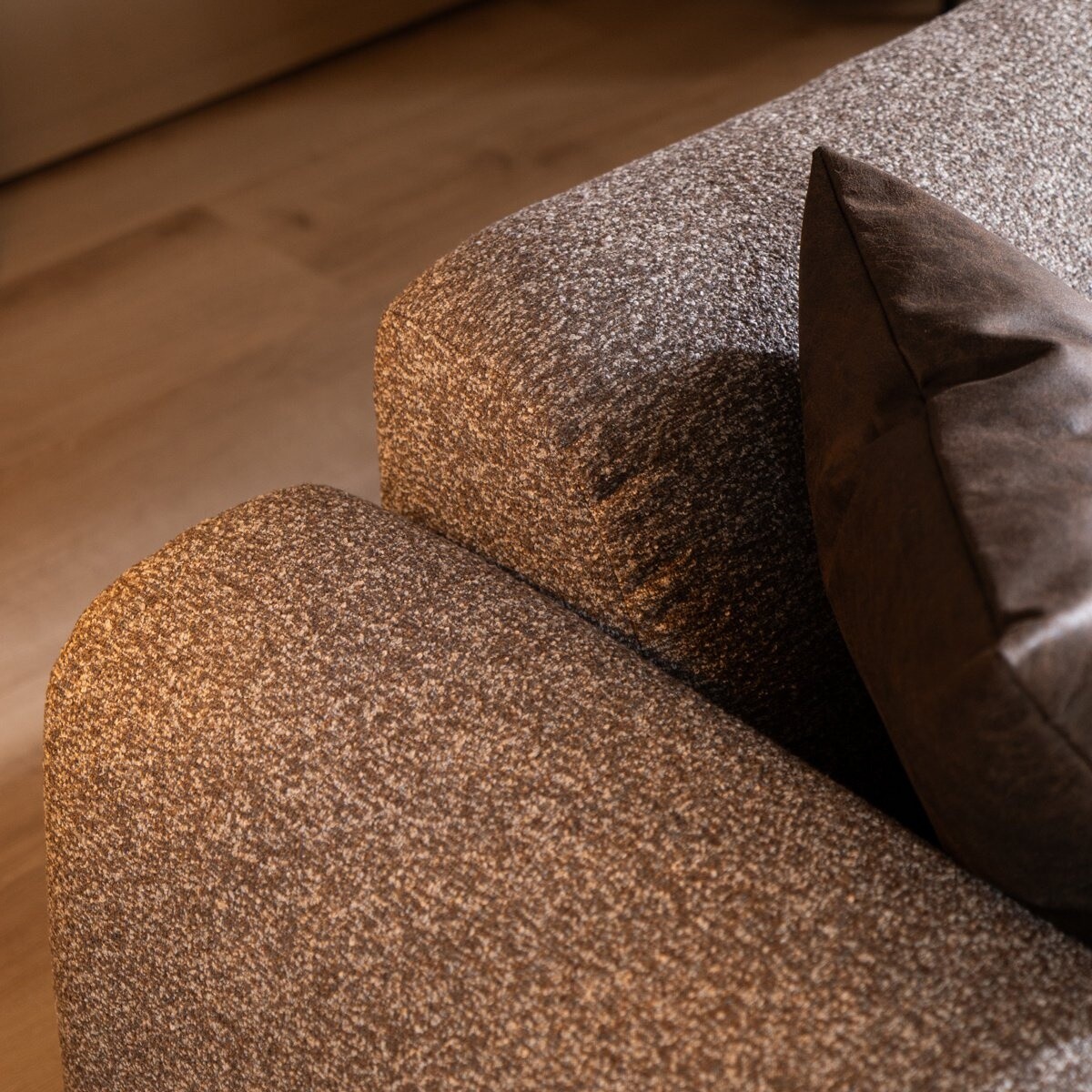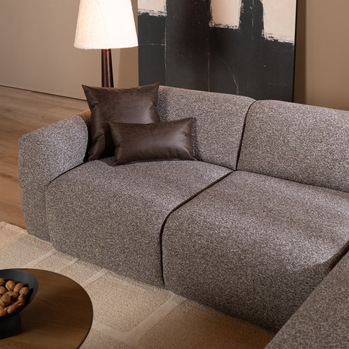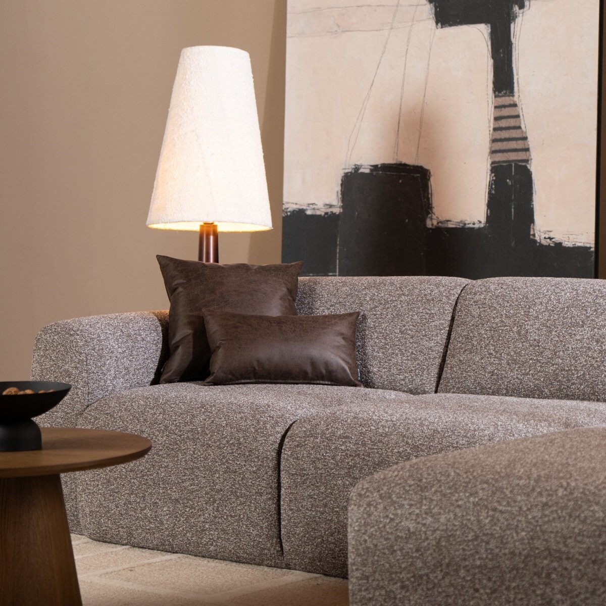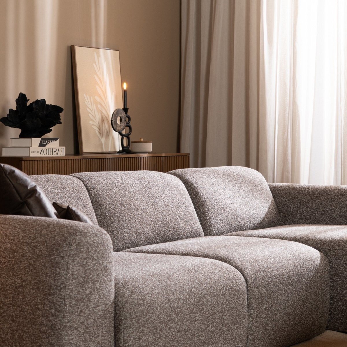 Le canapé d'angle Maine est l'équilibre parfait entre style et confort, fabriqué dans un joli tissu bouclé. Grâce à son design polyvalent, le Maine s'intègre facilement dans différents intérieurs. Les accoudoirs doux et arrondis invitent à s’asseoir confortablement, tandis que l’assise entièrement tapissée jusqu’au sol offre un aspect épuré et luxueux. Le canapé a un dossier bas et une assise basse, et convient pour 2 à 3 personnes.