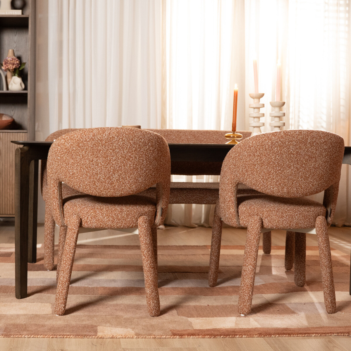 Le revêtement de la chaise de salle à manger est en tissu bouclé de haute qualité avec un fil mêlé, offrant une texture riche et un style moderne. Les pieds entièrement recouverts de tissu, associés à une structure en fer robuste, assurent stabilité et élégance. Le tissu est très résistant à l’usure et convient donc à un usage intensif par toute la famille.