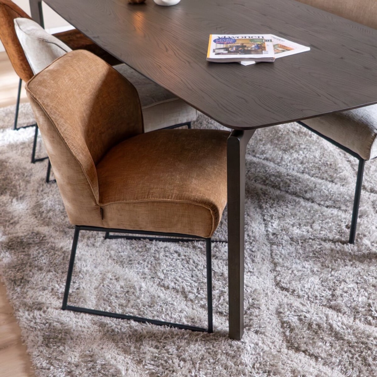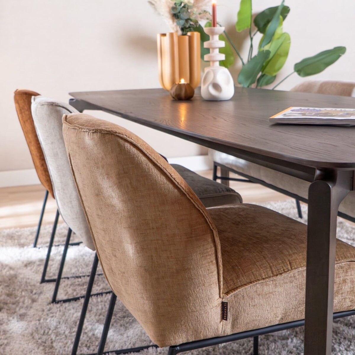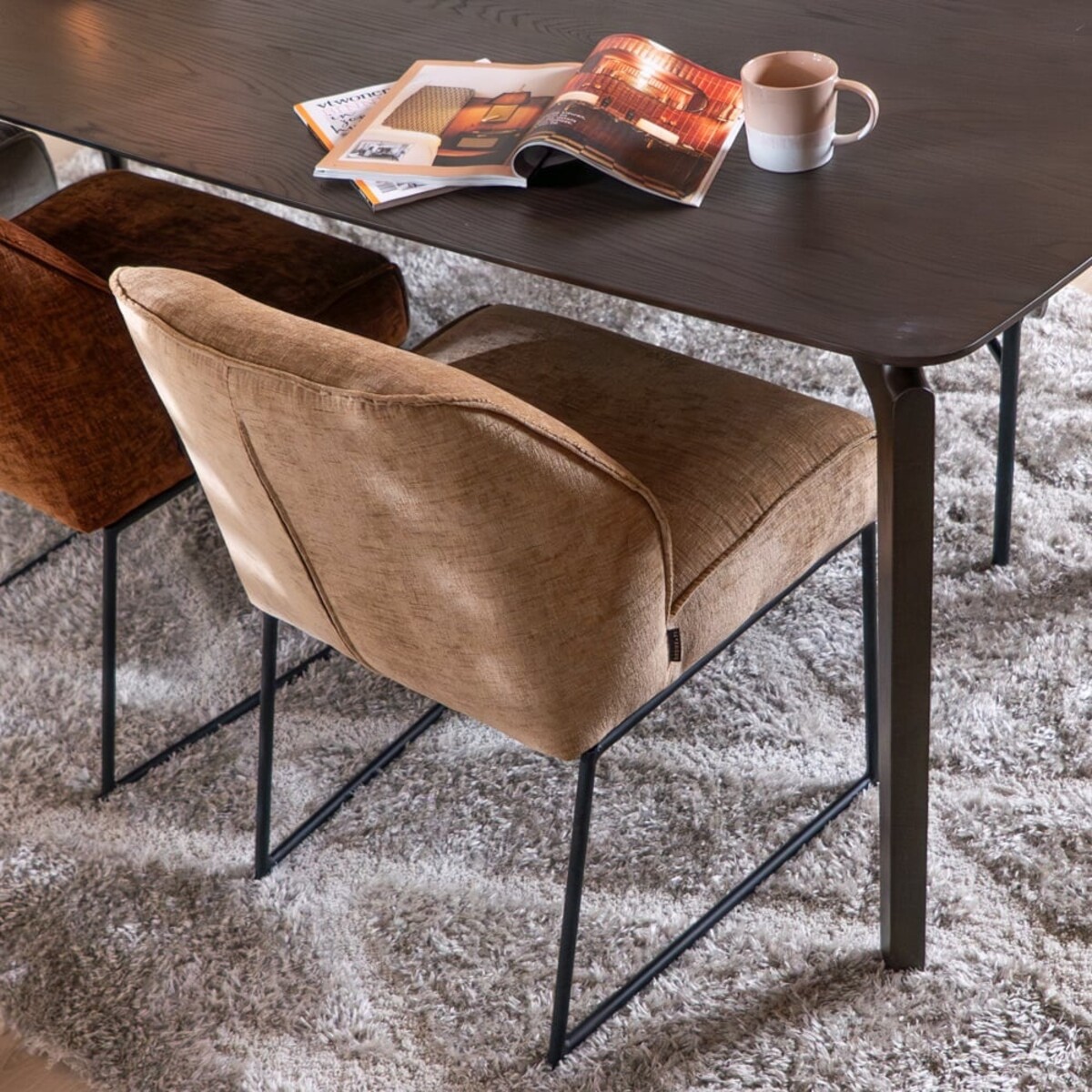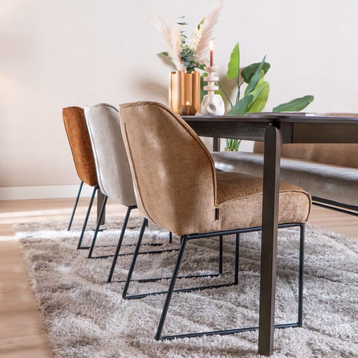 La chaise est recouverte du tissu chenille doux Eddy dans une teinte peach, qui s’intègre parfaitement dans un intérieur scandinave. Grâce aux suspensions nosag intégrées dans l’assise, vous bénéficiez d’un confort d’assise supplémentaire, idéal pour de longues soirées à table.