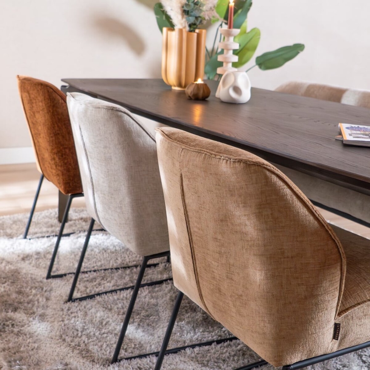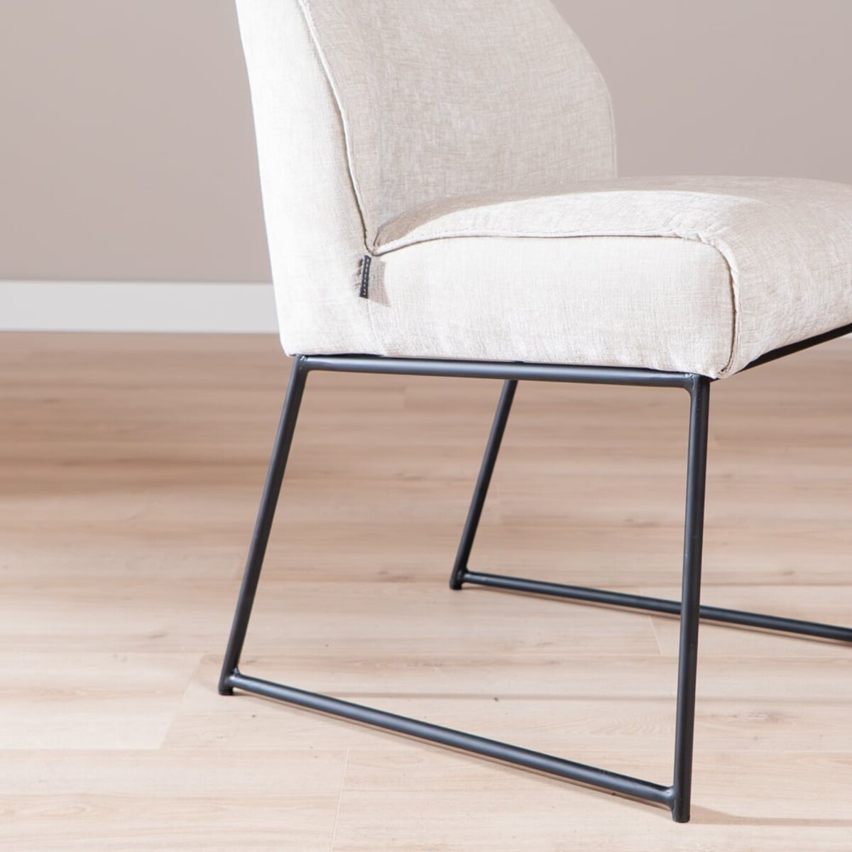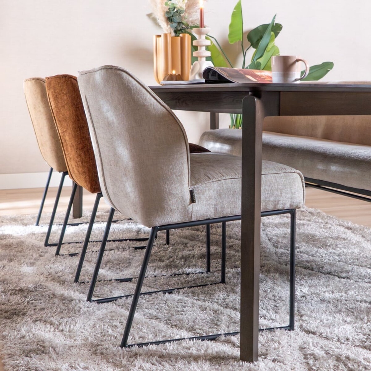 La chaise est recouverte du tissu chenille doux Eddy dans une teinte sable, qui s’intègre parfaitement dans un intérieur scandinave. Grâce aux suspensions nosag intégrées dans l’assise, vous bénéficiez d’un confort d’assise supplémentaire, idéal pour de longues soirées à table.