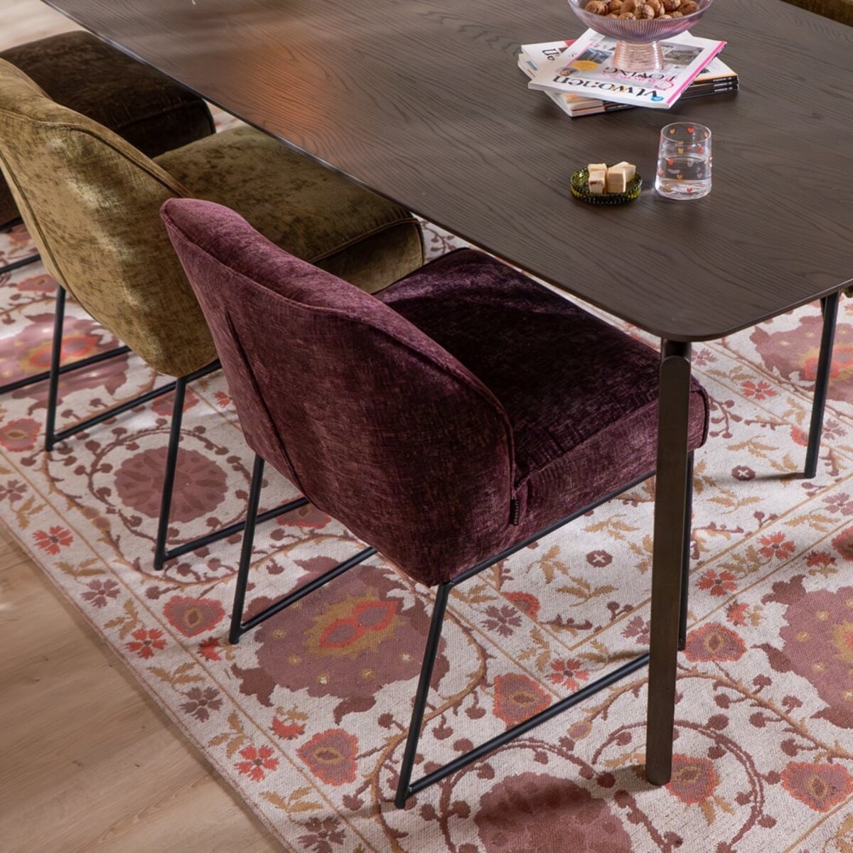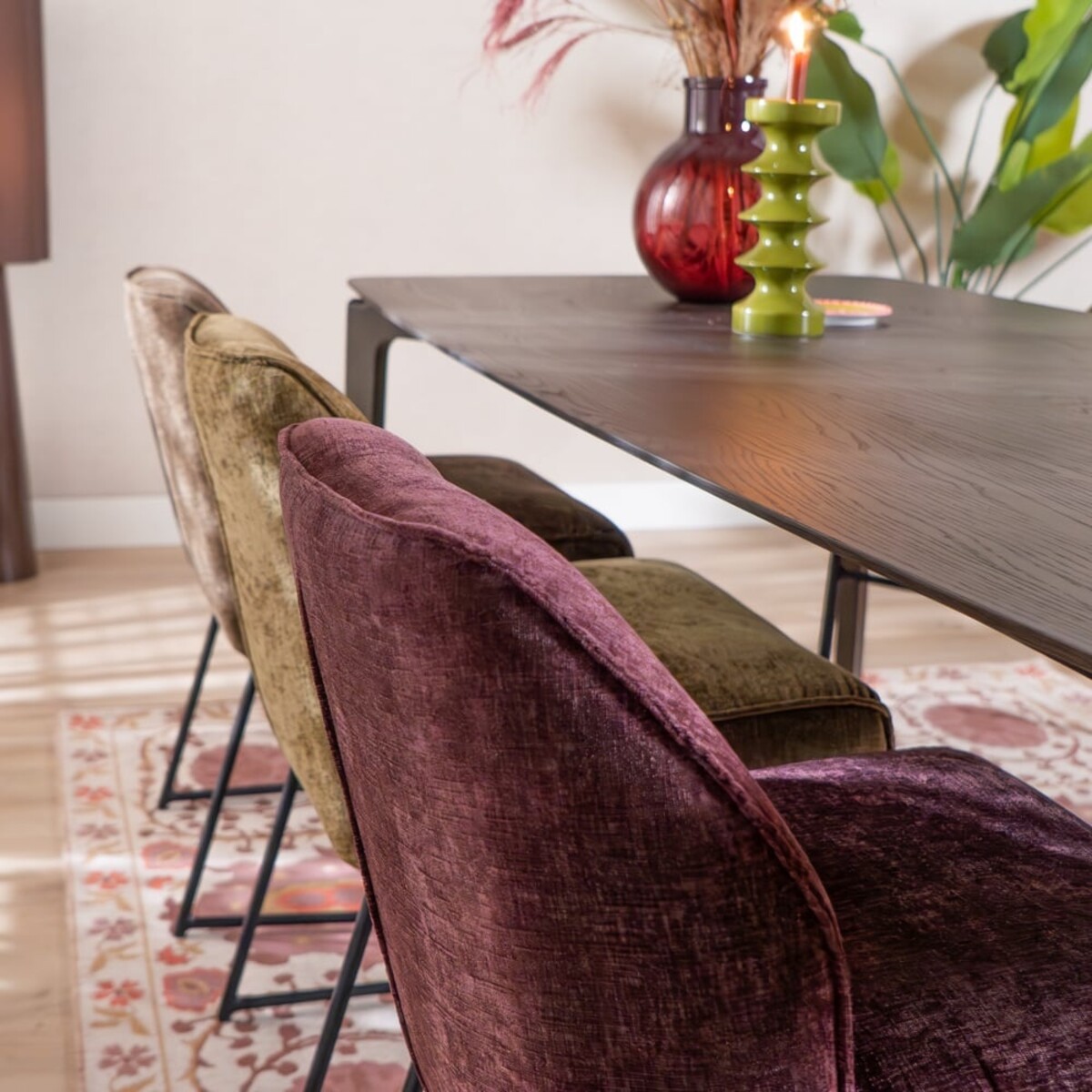 Découvrez la chaise de salle à manger Momo en chenille violette, un ajout unique à toute salle à manger. Cette chaise allie confort et finition pratique, idéale pour tous ceux qui recherchent un espace repas unique et coloré.