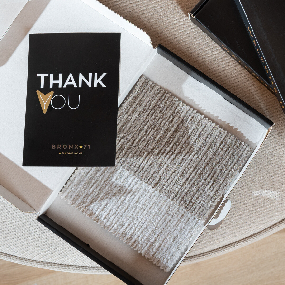 Pour l’envoi du kit d’échantillons, une participation de 6,95 € est demandée en plus du prix de vente. Dès que vous avez reçu le kit, vous recevez un bon d’achat d’une valeur de 12,50 €, que vous pouvez utiliser dans la boutique en ligne pour des produits fabriqués avec le même tissu. Ainsi, les frais du kit sont compensés lors de votre achat.