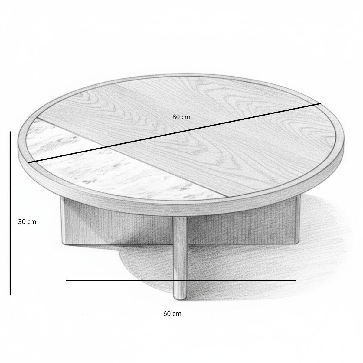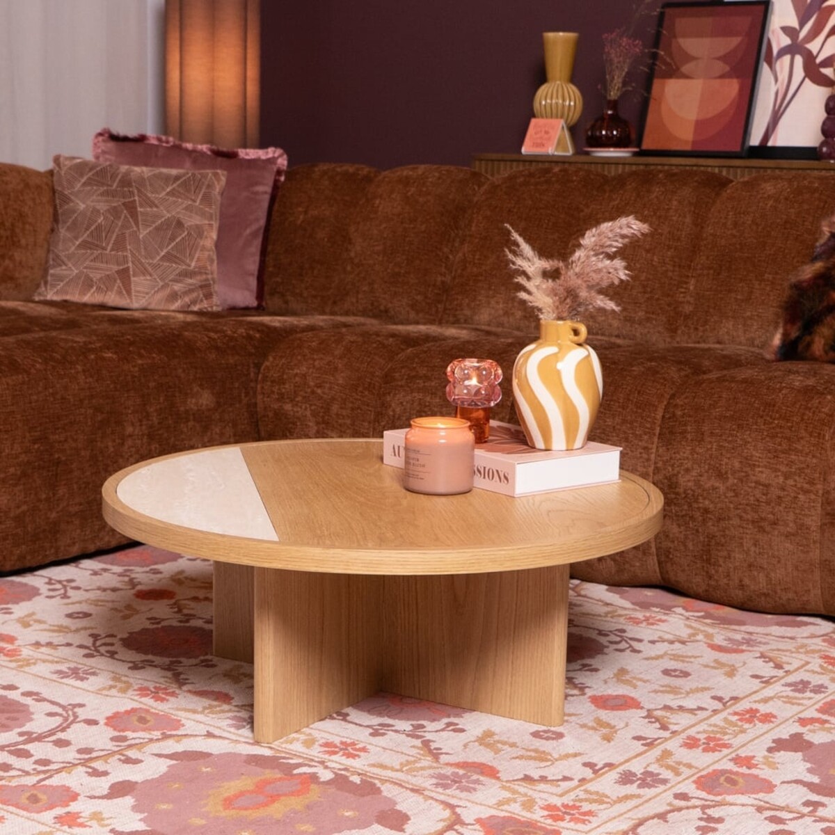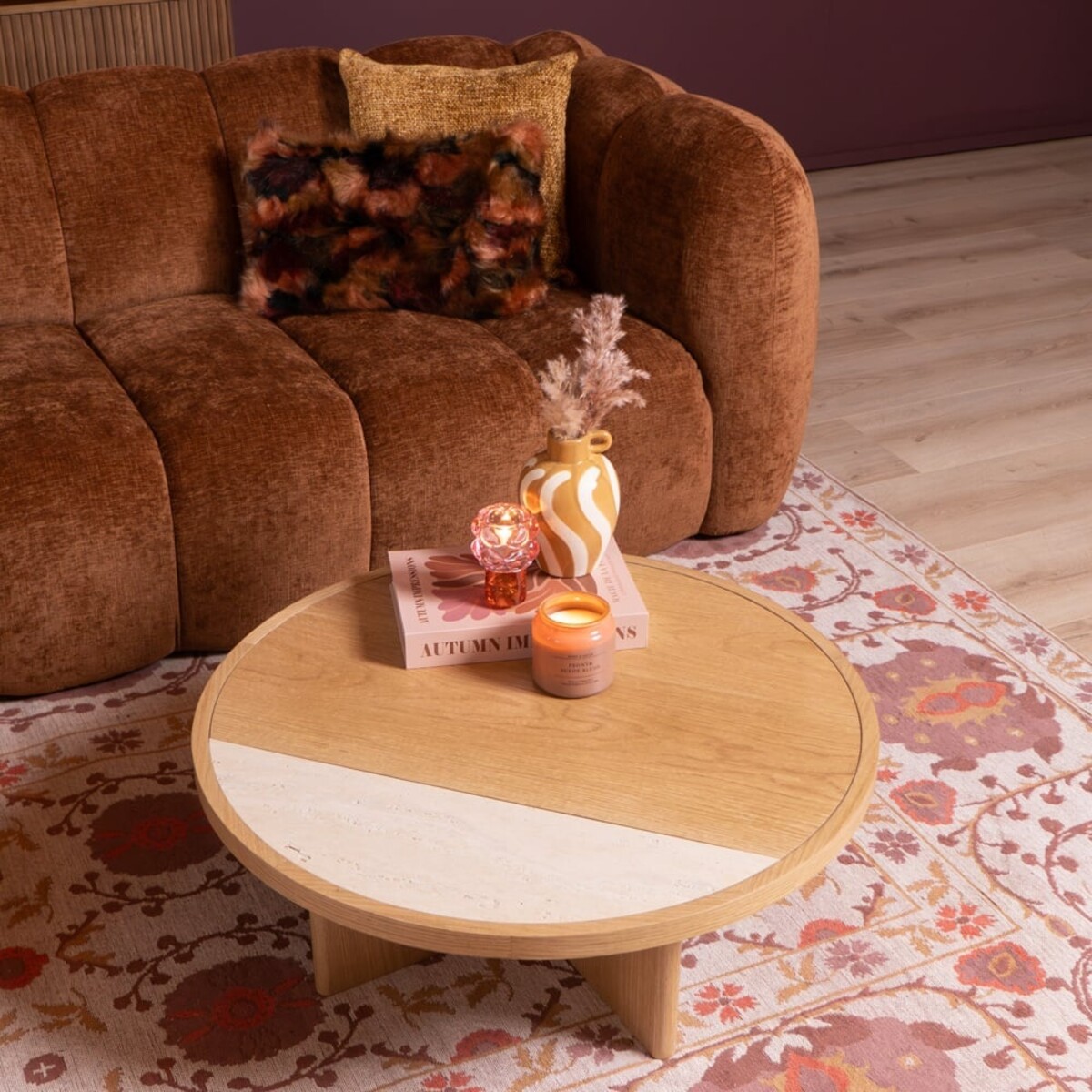 La table basse Maeva est un point central élégant pour tout salon. Avec sa forme ronde de Ø80 cm et le contraste marqué entre le bois de chêne et un détail incrusté en travertin, Maeva apporte un équilibre parfait entre élégance et matériaux naturels.