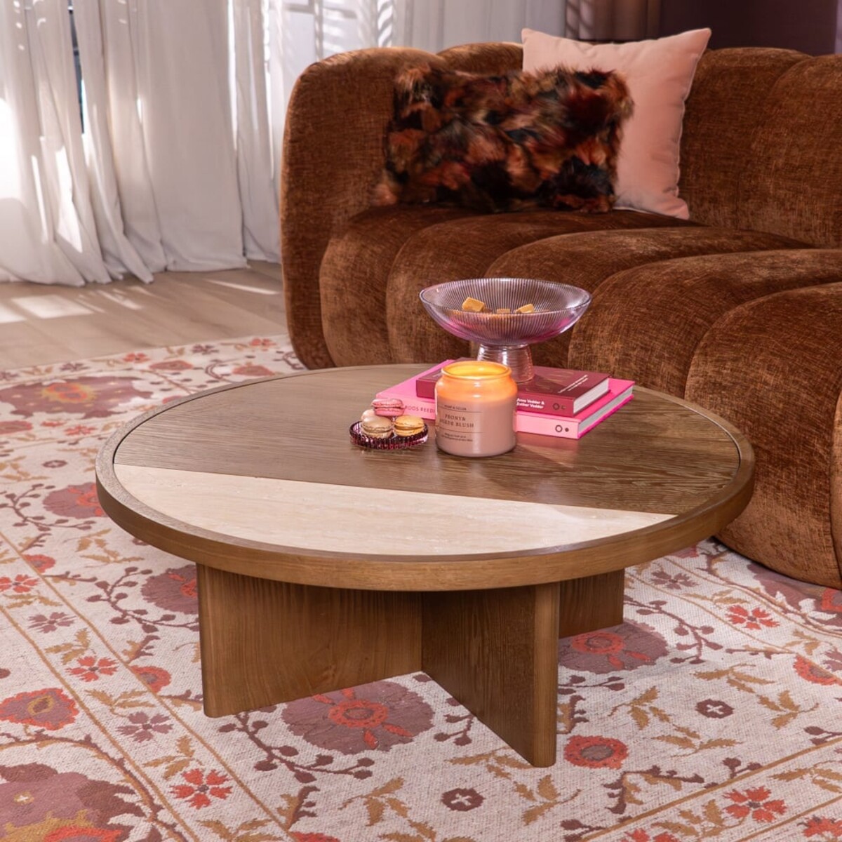 La table basse Maeva est un point central élégant pour tout salon. Avec sa forme ronde de Ø80 cm et le contraste marqué entre le bois de chêne et un détail incrusté en travertin, Maeva apporte un équilibre parfait entre élégance et matériaux naturels.
